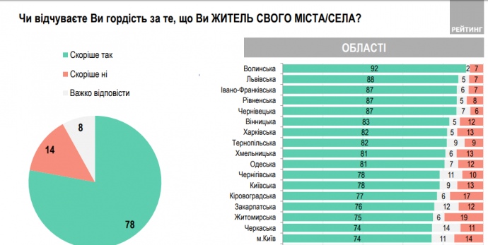Зазначається, що 74% опитаних відчувають гордість, що вони є мешканцями своєї області, 78% - свого міста/села.