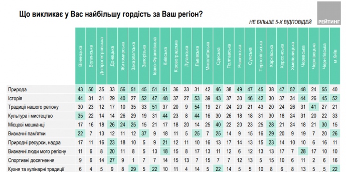 Традиціями свого краю пишаються 27%, культурою і мистецтвом - 26%, місцевими мешканцями - 22%, визначними пам'ятками - 18%, природніми ресурсами - 14%, визначними людьми - 12%, спортивними досягненнями та кухнею - по 11%", - йдеться у звіті.