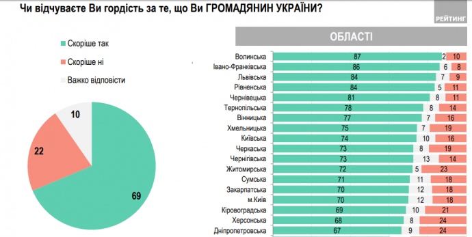 Водночас близько третини опитаних у Донецькій, Луганській, Харківській, Полтавській, Запорізькій та Одеській областях не мають почуття гордості за те, що є громадянами України.
