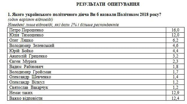Політиком 2018 року 16% населення, як і торік, назвали Петра Порошенка (у 2017р. – 10%).
