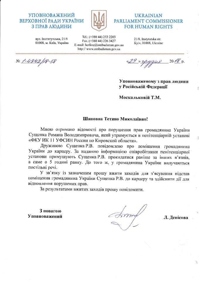 Денісова зазначила, що звернулася до уповноваженого з прав людини в Російській Федерації Тетяни Москалькової з вимогою негайно з’ясувати підстави поміщення Сущенка до карцеру та здійснити необхідні дії щодо відновлення порушених прав українця.