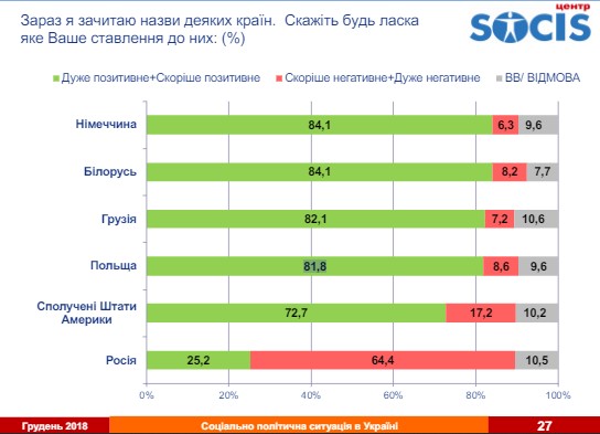 До Білорусі позитивно ставляться 84,1%, негативно – 8,2%. До Грузії позитивно 82,1%, негативно – 7,2%, до Польщі позитивно 81,8%, негативно – 8,6%.