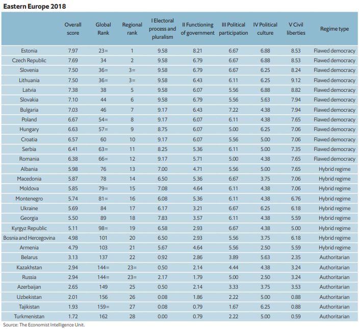 Україна посіла 84-те місце у рейтингу "Індекс демократії 2018", лишивши за собою статус "гібридного режиму".