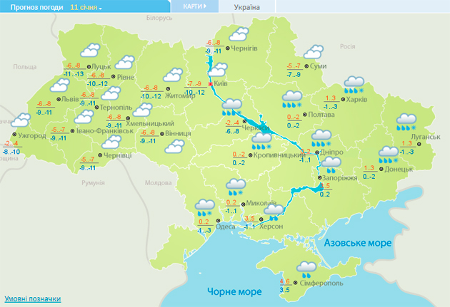 У Києві 11 січня без істотних опадів, на дорогах ожеледиця. Вітер північний, 5-10 м/с. Температура вночі 10-12°, вдень 7-9° морозу.