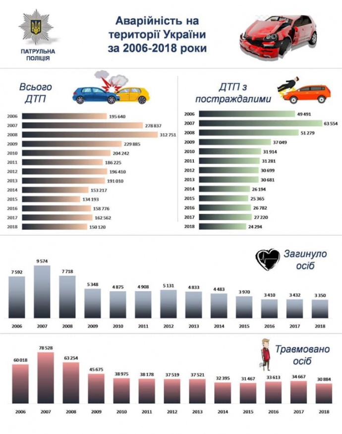 Зокрема, в 2018 році, в порівнянні з роком 2017 на дорогах України сталось: