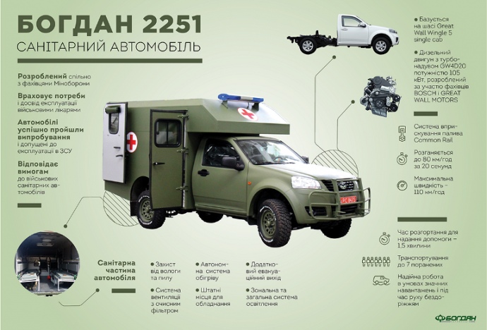 "Українська армія отримає модернізовані автомобілі "Богдан 2251". У 2018 році вони отримали низку змін, які узгоджувалися із військовими медиками та представниками Міністерства оборони. Тепер модернізовані "Богдан 2251" поступово замінюють застарілі радянські УАЗи, отримуючи схвальні відгуки від представників ЗСУ", – кажуть у виробника.