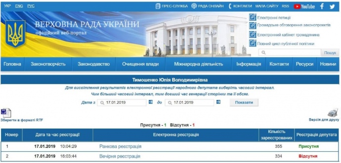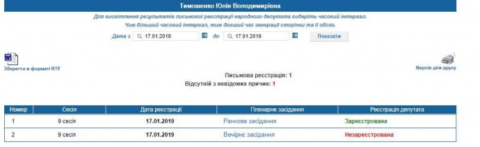 Тимошенко начебто зареєструвалася на ранковому пленарному засіданні в четвер, 17 січня.
