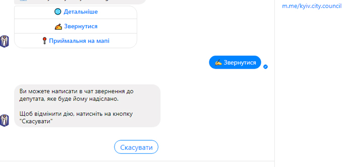 Офіційна сторінка Київської міської ради у Facebook запустила чат-бота у месенджері, який допоможе знайти найближчу депутатську приймальню і навіть подати звернення.