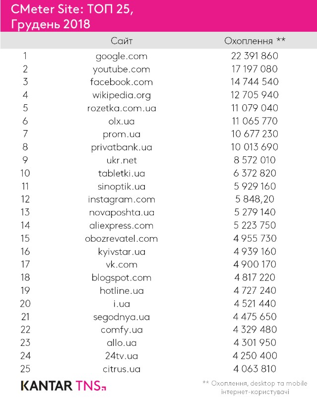 За даними Kantar TNS CMeter, серед заборонених ресурсів у 2017 році, тільки російська соціальна мережа "Вконтанте" утримується в ТОП 25 сайтів – 17-те місце в грудні 2018 року проти 10-го у грудні 2017 року.