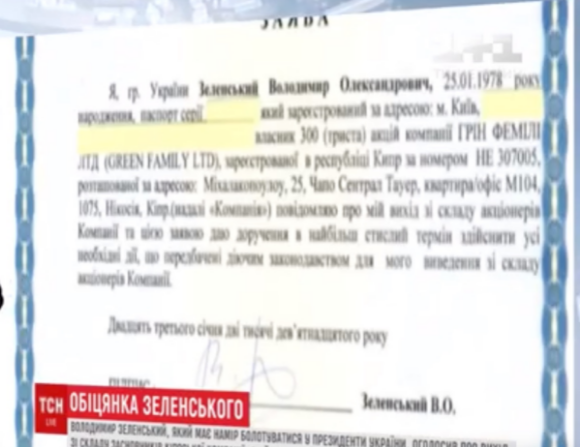 У документі, який Зеленський показав на відео, йдеться, що він володіє 300 акціями компанії Green Family LTD, і заявляє про свій вихід зі складу акціонерів компанії. А також дає доручення "в найбільш стислий термін здійснити усі необхідні дії, що передбачені діючим законодавством для мого виведення зі складу акціонерів компанії".