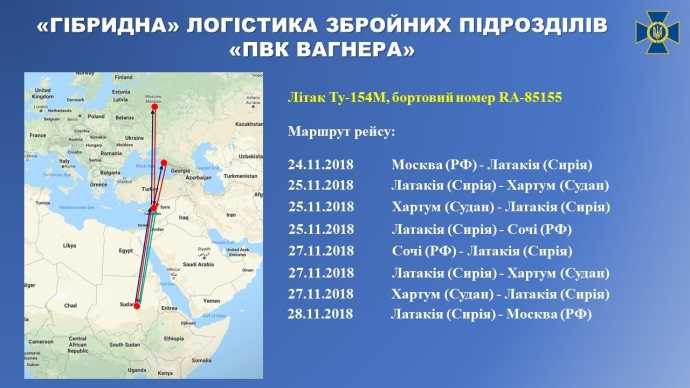 "Так, відповідно до договору № В218/04/119 від 30.07.2018 (загальна сума 56 млн російських рублів) між зазначеним вище ТОВ "М Інвест" та "223 льотним загоном" МО РФ, літаками Ту-154М (бортові номери RA-85041, RA-85155) за п’ять місяців 2018 року здійснено вісім рейсів з Москви (через російську авіабазу Хмеймім у сирійській Латакії) до столиці Судану Хартум2, - розповіли у Службі безпеки України.
