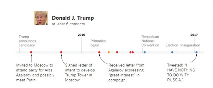 "Серед контактів - більше 100 особистих зустрічей, телефонних дзвінків, текстових повідомлень, електронних листів і особистих повідомлень у Твіттері. Трамп і представники його кампанії неодноразово заперечували, що мали такі контакти з росіянами під час виборів 2016 року", - відзначає NYT.