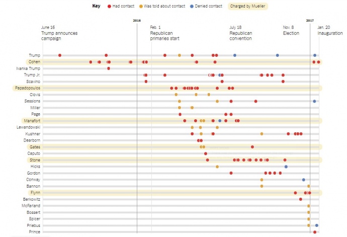 За даними видання, у період з червня 2015 року, коли Трамп заявив про намір балотуватися в президенти до його інавгурації у січні 2017-го щонайменше 17 посадових осіб та радників виборчої кампанії Трампа мали такі контакти.