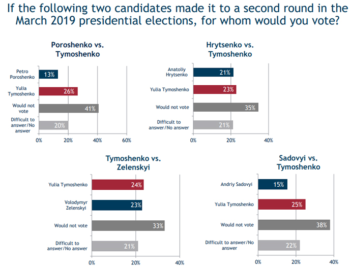 У парах Тимошенко – Порошенко, Тимошенко – Садовий, Тимошенко – Бойко і Тимошенко – Вакарчук – перемогла би Тимошенко. Лише у парі Тимошенко – Зеленський і Тимошенко – Гриценко обоє кандидатів мали б приблизно однакові шанси на перемогу.