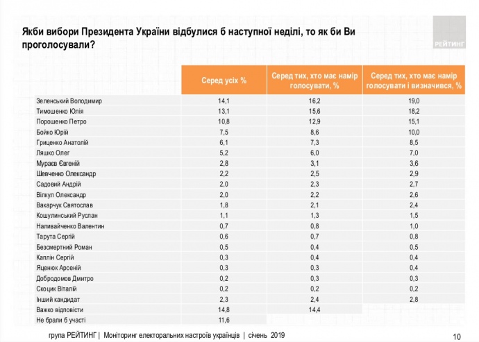 Підтримка інших кандидатів виглядає наступним чином: у Юрія Бойка – 10,0%, Анатолія Гриценка – 8,5%, Олега Ляшка – 7,0%, Євгена Мураєва – 3,6%, Олександра Шевченка – 2,9%, Андрія Садового – 2,7%, Олександра Вілкула – 2,6%.