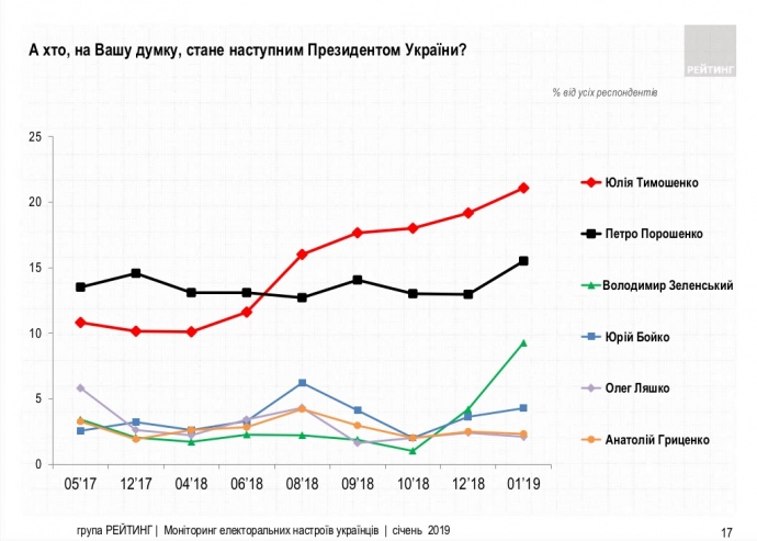 23% респондентів вважають, що наступним президентом буде Тимошенко. У перемогу Порошенка вірять 16,3%, Зеленського – 10,3%.