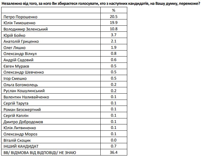 При цьому 20,5% респондентів вважають, що на виборах президента переможе Петро Порошенко, 19,9% – що переможе Юлiя Тимошенко, а в перемогу Володимира Зеленського вірять лише 10,8% опитаних.