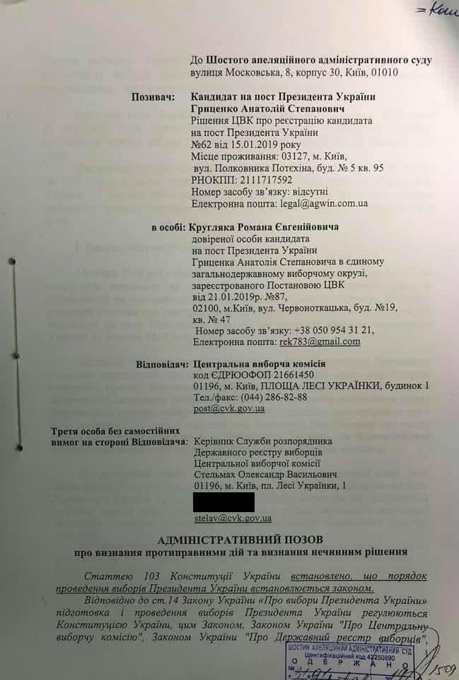 "Подав до суду на ЦВК. Через протизаконну вимогу до кандидата в президенти працювати з Державним реєстром виборців виключно в будівлі ЦВК", – заявляє Гриценко і публікує фото свого адміністративного позову.