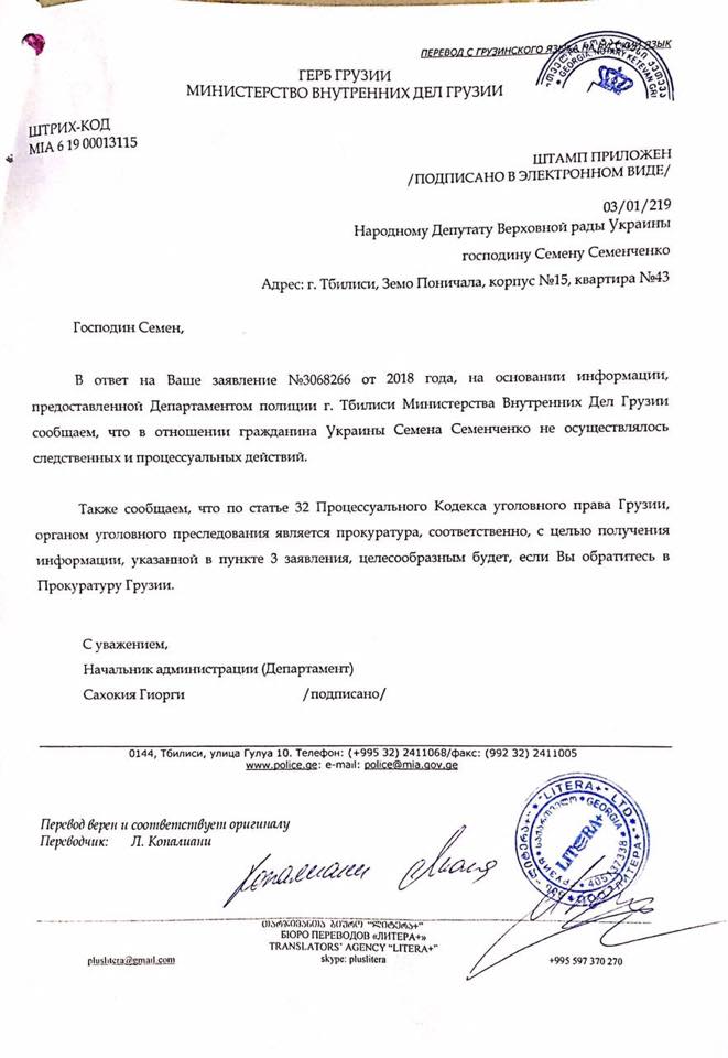 "МВС Грузії було надано роз'яснення, що стосовно громадянина України Семенченка взагалі не здійснювалося жодних процесуальних або слідчих дій", – повідомляє нардеп.