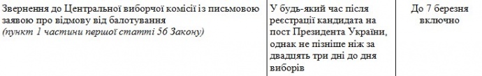 Після отримання заяви про відмову від балотування, члени ЦВК повинні окремим рішенням задовольнити прохання кандидата (до 8 березня).