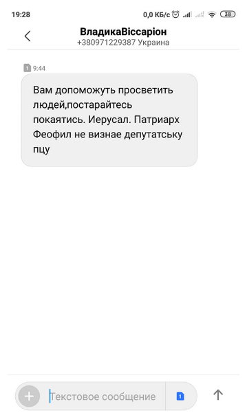 "На священиків, які перейшли в Православну Церкву України, чиниться тиск ієрархом Російської Церкви в Україні митрополитом Овруцьким і Коростенським Віссаріоном. Він розсилає духовенству смс-повідомлення з погрозами та закликами до покаяння.