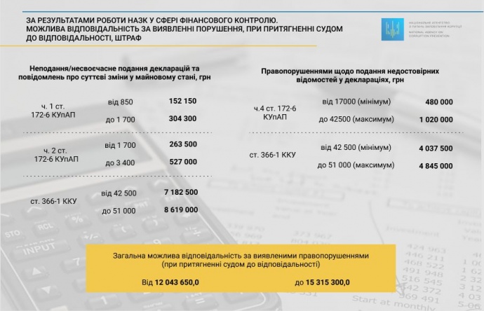 Зазначається, що протягом 2017-2018 років у сфері фінансового контролю агенція склала 273 обґрунтовані висновки, з них 99 – щодо декларування недостовірних відомостей, 5 – щодо незаконного збагачення, 169 – щодо умисного неподання декларацій.