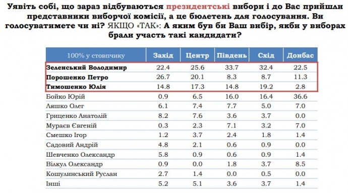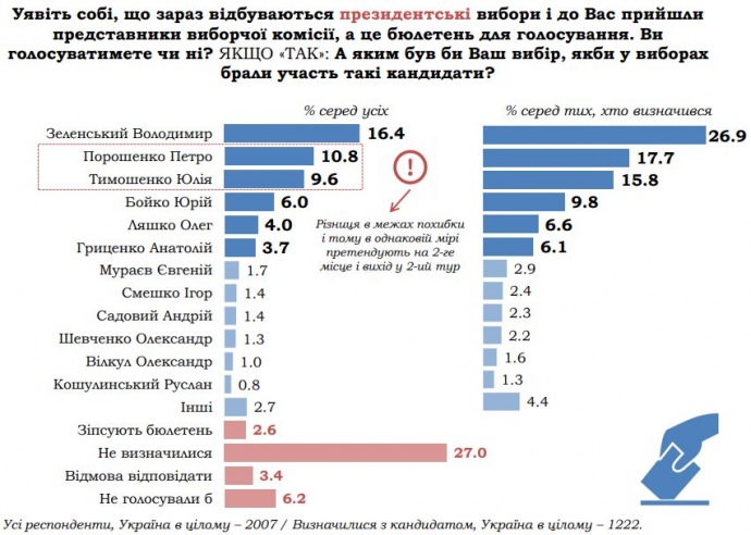Серед усіх опитаних за Зеленського проголосували б 16,4%, за Порошенка – 10,8%, а за Тимошенко – 9,6%, але 27% респондентів ще не визначилися з вибором.