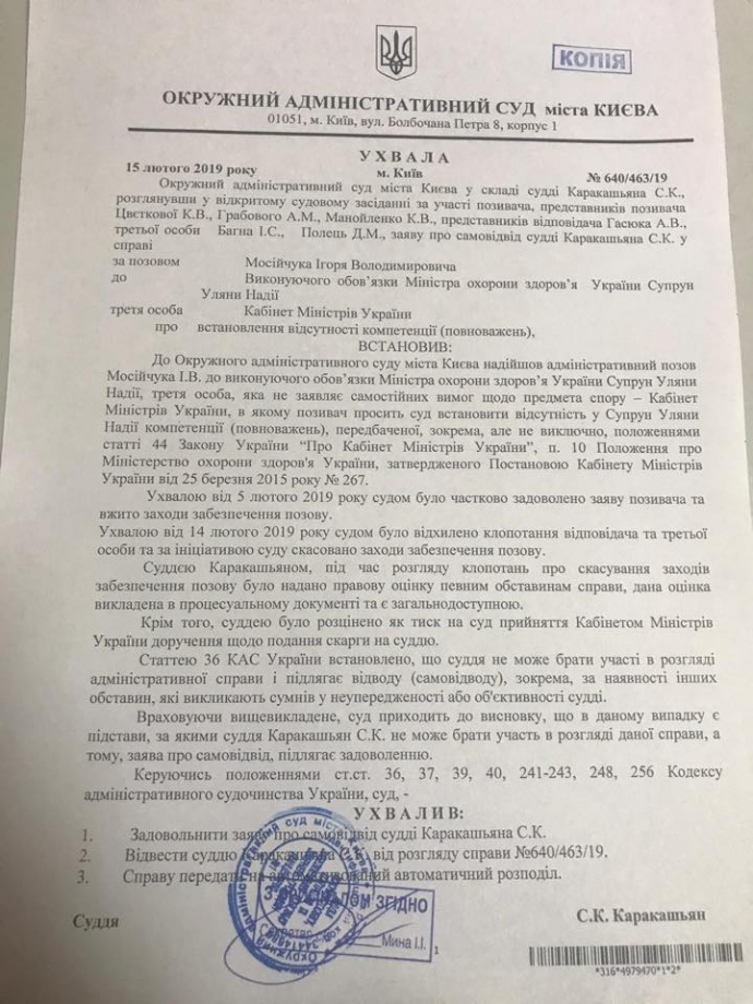 Суддя Сергій Каракашьян, який розглядає справу за позовом народного депутата Ігора Мосійчука проти очільниці Міністерства охорони здоров’я Уляни Супрун, заявив про самовідвід.