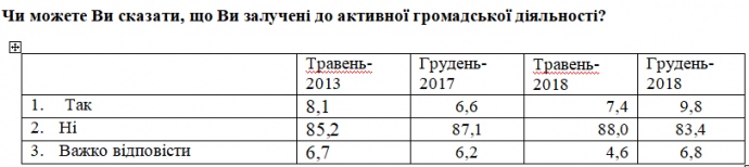 Незначна частина опитаних громадян вважає себе залученою до активної громадської діяльності, причому цей відсоток протягом 2013–2018 рр. стабільно становить 8–10%.