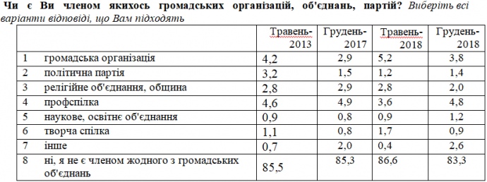 З 2013 року фактично не зросло членство громадян у різних громадських об’єднаннях: 15–17%.