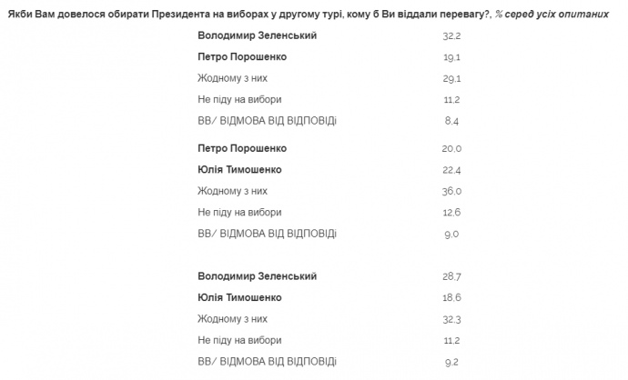 Зазначається, що якщо у другому турі виборів президента зійдуться Зеленський та Порошенко, то за шоумена готові віддати свої голоси 32,2% опитаних серед усіх респондентів, а за діючого президента - 19,1%.