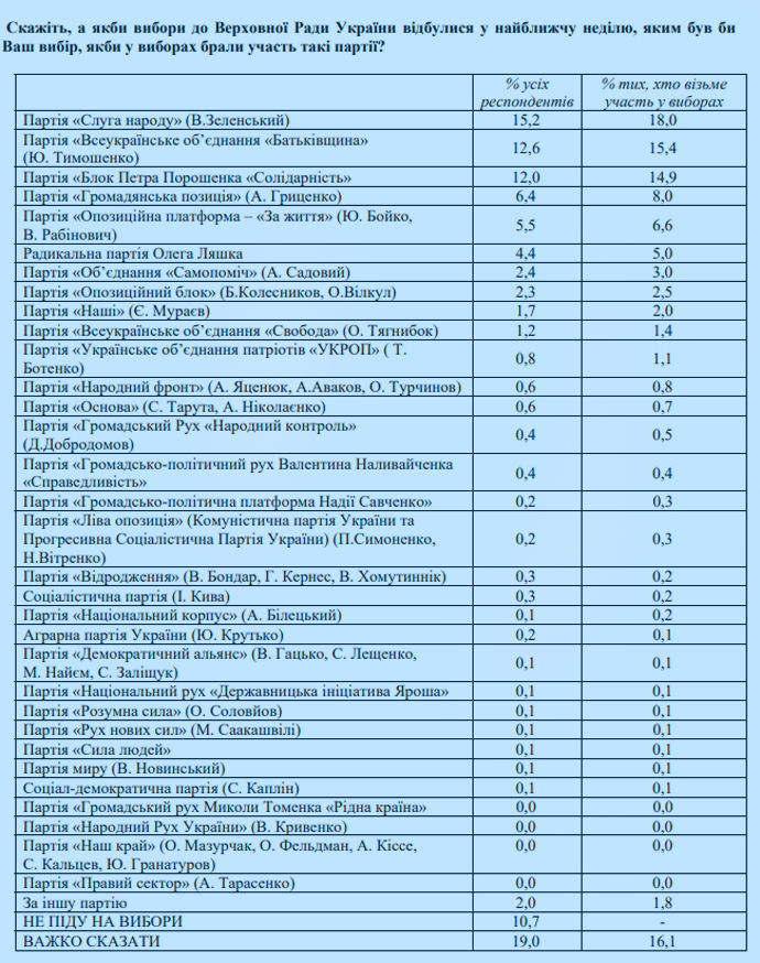 Так, партію "Слуга народу" готові підтримати 18% тих, хто піде на вибори, ВО "Батьківщина" – 15,4%, Блок Петра Порошенка "Солідарність" – 14,9%, "Громадянську позицію" – 8%, "Опозиційну платформу – "За життя" – 6,6%, Радикальну партію Олега Ляшка – 5%.
