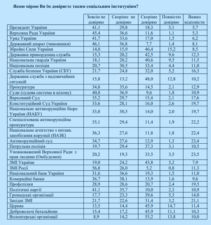 Разом з тим довіру громадяни найчастіше висловлюють волонтерським організаціям (їм довіряють 67% опитаних), Збройним силам (62%), Держслужбі з надзвичайних ситуацій (61%), церкві (61%), добровольчим батальйонам (57%).