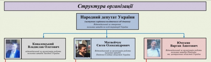 Так, у регіонах створено мережу за принципом "піраміди": керівник штабу виборчого округу – керівник сектору – старший виборчий дільниці – спостерігач – агітатор – виборець.