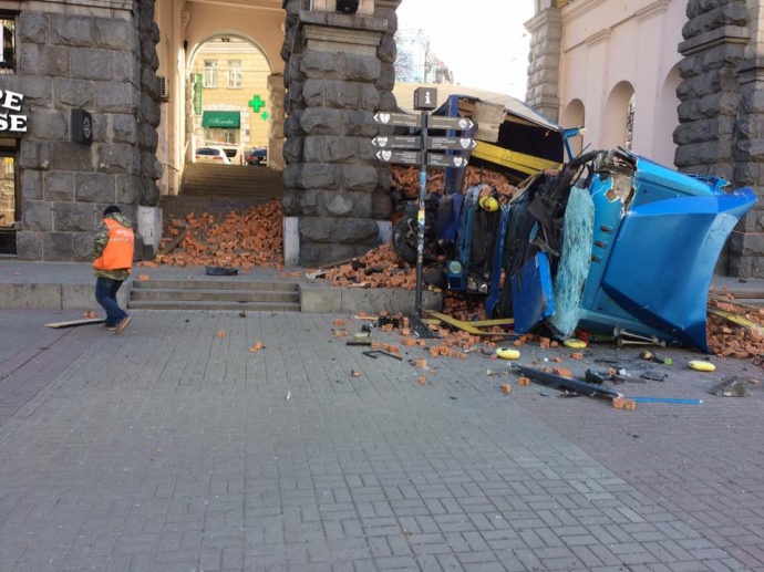 Некерована фура з цеглою пошкодила машину і вилетіла на тротуар Хрещатика
