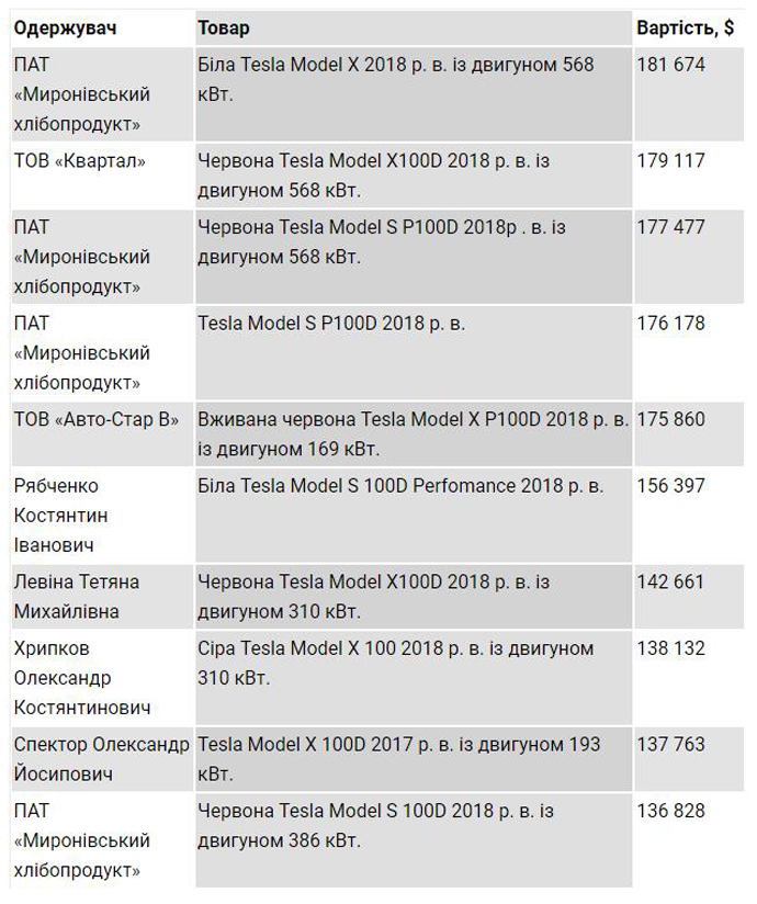 У минулому році агрохолдинг "Миронівський хлібопродукт" мільярдера Юрія Косюка ввіз у країну чотири електрокари Tesla загальною вартістю 672 тисячі доларів.