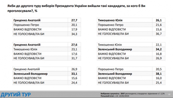 Зеленский у другому турі перемагає і Тимошенко (34,2% проти 22,1%) і Порошенка (38,1% проти 20,5%).
