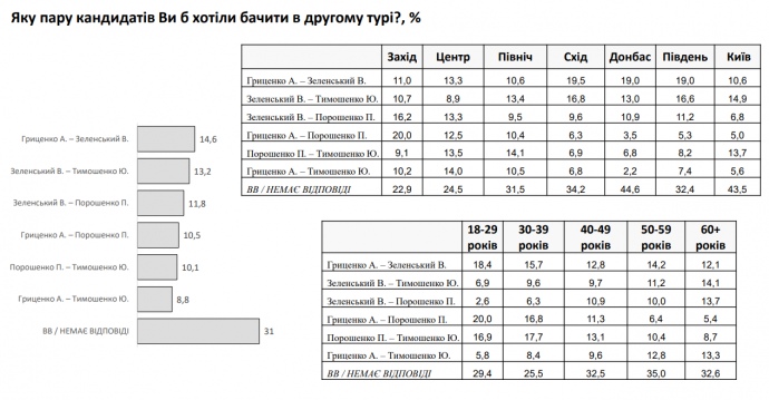Також в опитуванні сказано, що 10,5% респондентів хотіли би бачити у другому турі президентських виборів Гриценка і Порошенка, 10,1% - Порошенка і Тимошенко, а 8,8% - Гриценка і Тимошенко.