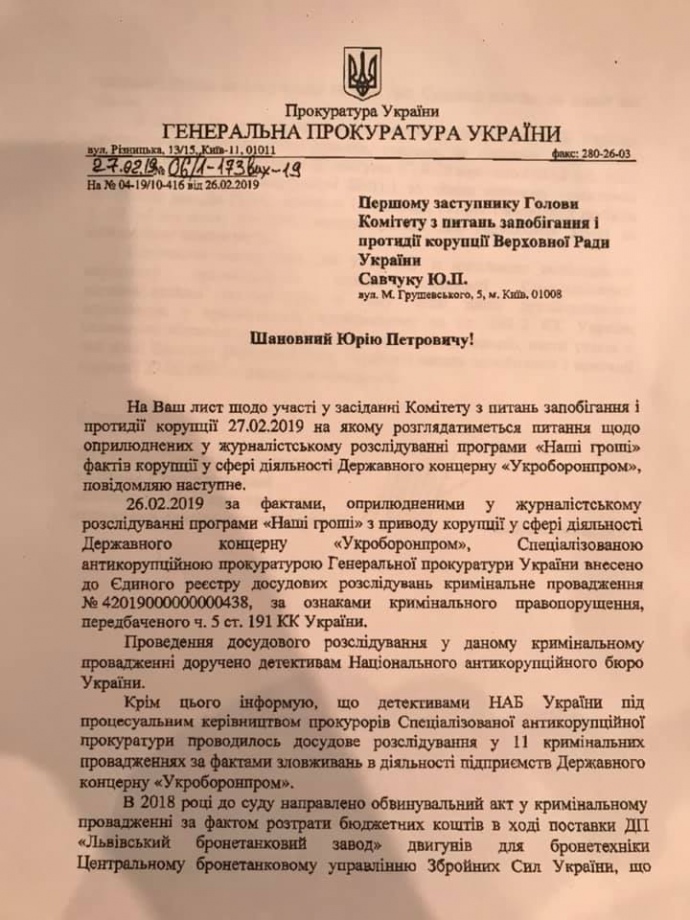 Разом з тим Холодницький додав, що 26 лютого за фактами, оприлюдненими у журналістському розслідуванні програми "Наші гроші" у сфері діяльності ДК "Укроборонпром", САП внесла до Єдиного реєстру досудових розслідувань кримінальне провадження №42019000000000438 за ознаками кримінального правопорушення, передбаченого ч.5 ст. 191 ККУ (привласнення розтрата майна або заволодіння ним шляхом зловживання службовим становищем).