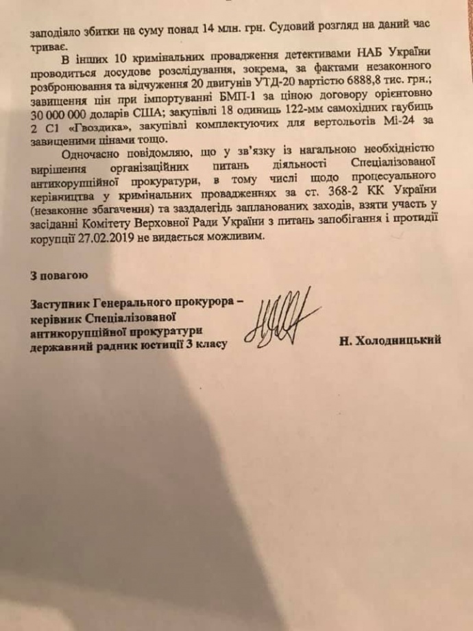 Таку відповідь він направив першому заступнику Голови Комітету з питань запобігання корупції Верховної Ради Юрію Савчуку, відповідний документ є у розпорядженні "Української правди".