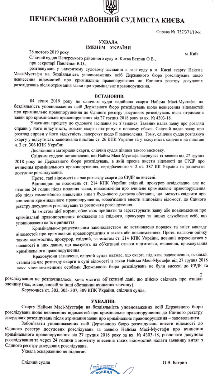 Про це йдеться в ухвалі суду від 28 лютого, повідомляє адвокат Масі Найєм у Facebook.