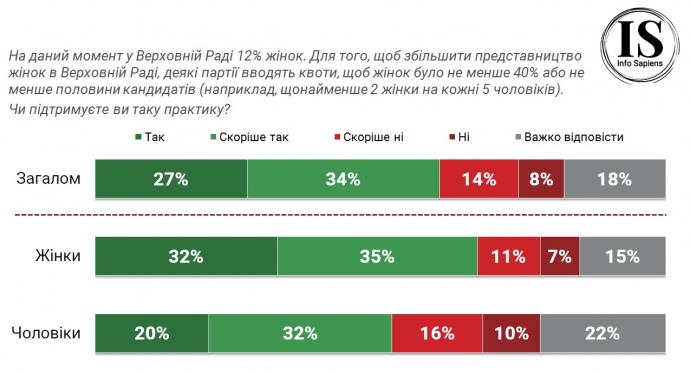 61% опитаних українців підтримали б впровадження гендерних квот для збільшення представництва жінок у Верховній Раді, а 22% висловилися проти.