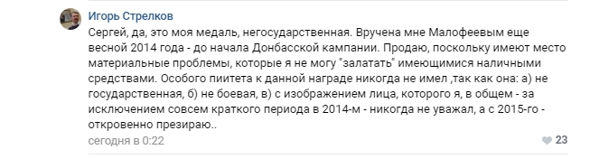 На своїй сторінці "ВКонтакте" Стрєлков підтвердив, що продає нагороду.