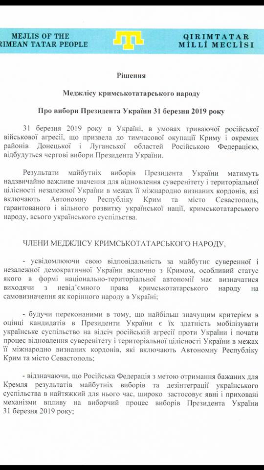 Також члени Меджлісу закликали громадян України, що проживають на території окупованого Криму, взяти участь у виборах на дільницях, розташованих на материковій частині України.