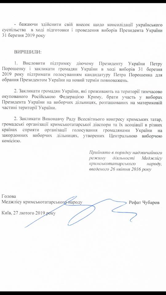 "Після офіційної реєстрації Петра Порошенка кандидатом у президенти України прийняте раніше за "основу" рішення було направлено членам Меджлісу для внесення ними можливих доповнень і змін. З їх урахуванням рішення було схвалено та підписано 27 лютого", - повідомив Чубаров.