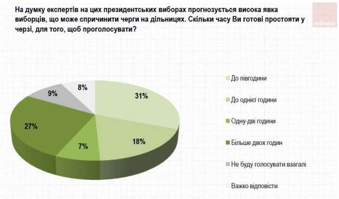 Лише третина опитаних готові простояти в черзі на дільниці більше однієї години. Третина готові чекати в черзі до півгодини, ще кожен п’ятий – до години.
