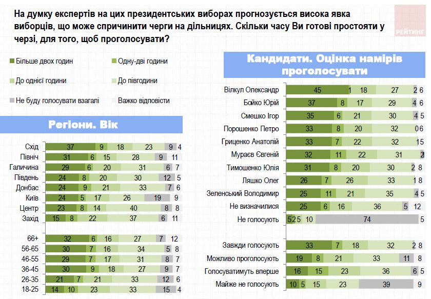 Найбільш "стійкий" виборець – на сході, півночі та на Галичині, серед найстарших опитаних, виборців Вілкула та Бойка. А симпатики Зеленського, Ляшка й ті, хто не визначилися, висловили найменшу готовність довго стояти в черзі, щоб віддати свій голос.