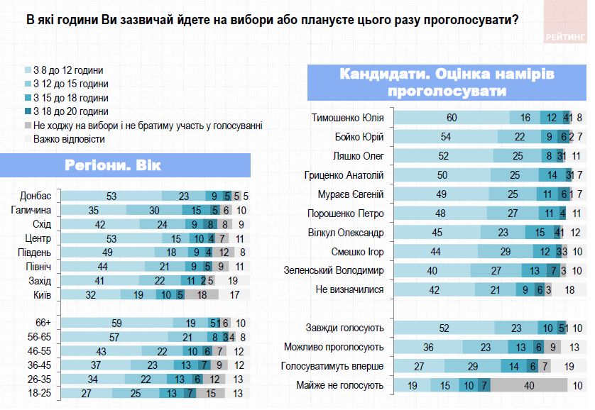 Серед тих, хто зазвичай голосує на виборах, більшість робить це зранку – і найбільше таких серед виборців Тимошенко, Бойка та Ляшка.