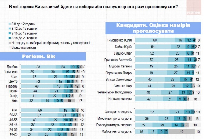 У регіональному розрізі відносно більше тих, хто голосує зранку серед мешканців південних та центральних регіонів, а також Донбасу, тоді як на Галичині відносно більше тих, хто голосує між 12 та 15 годинами.
