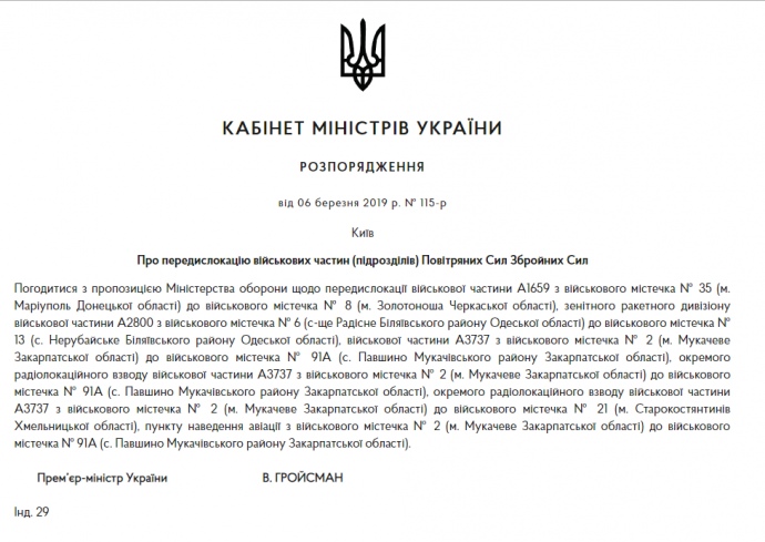 Кабінет міністрів затвердив розпорядження про передислокацію військових частин (підрозділів) Повітряних Сил Збройних Сил України.